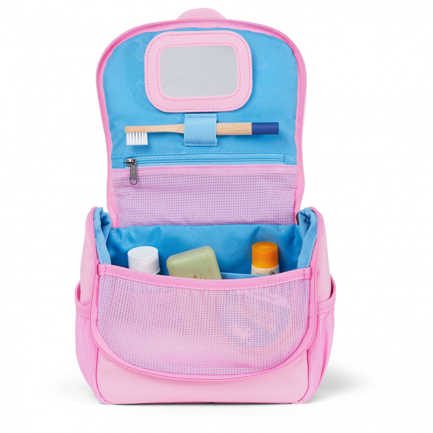 - Lengua para estirar con etiqueta para nombre; detalles bordados; gancho oculto; espejo con fijación de gancho y bucle; soporte para cepillo de dientes