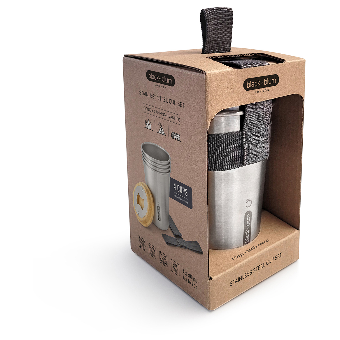 - 4 vasos, tapa de bambú con abrebotellas integrado; cinta de nailon