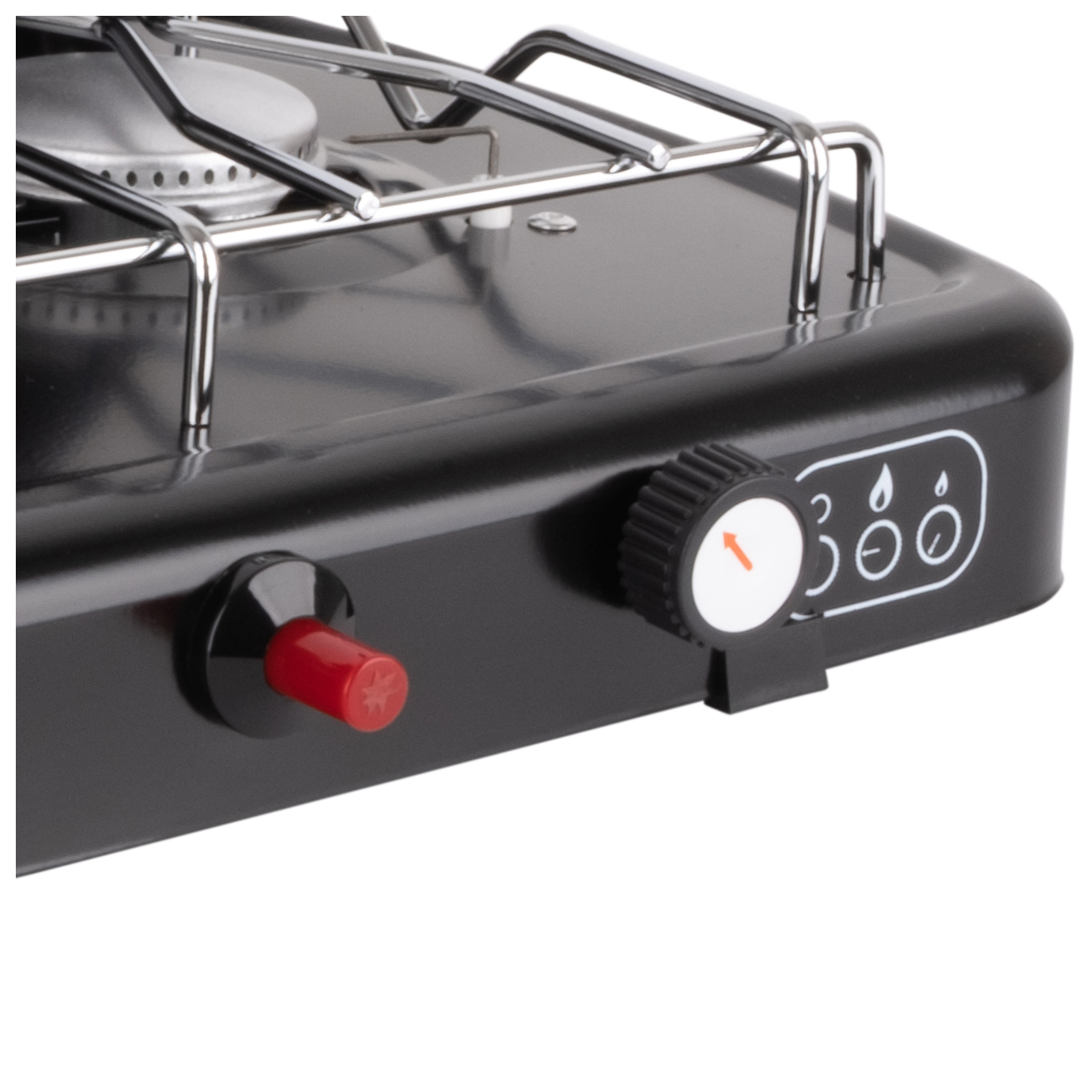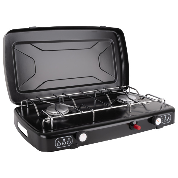 - 2 quemadores regulables; parrilla y tapa metálica desmontables; Boquilla de conexión para manguera