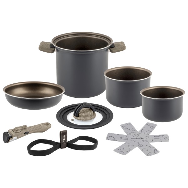 - 5 ollas (apilables); mangos desmontables; 2 tapas, protector de sartén/olla; asa de transporte