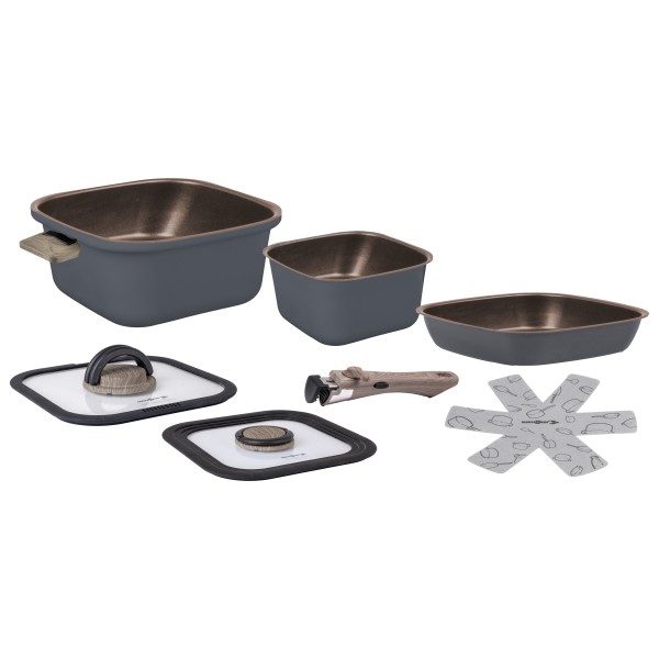 - olla 20 x 20 x 15 cm; olla 16 x 16 x 12 cm; sartén 20 x 20 x 5 cm; 2 tapas; asa de sartén