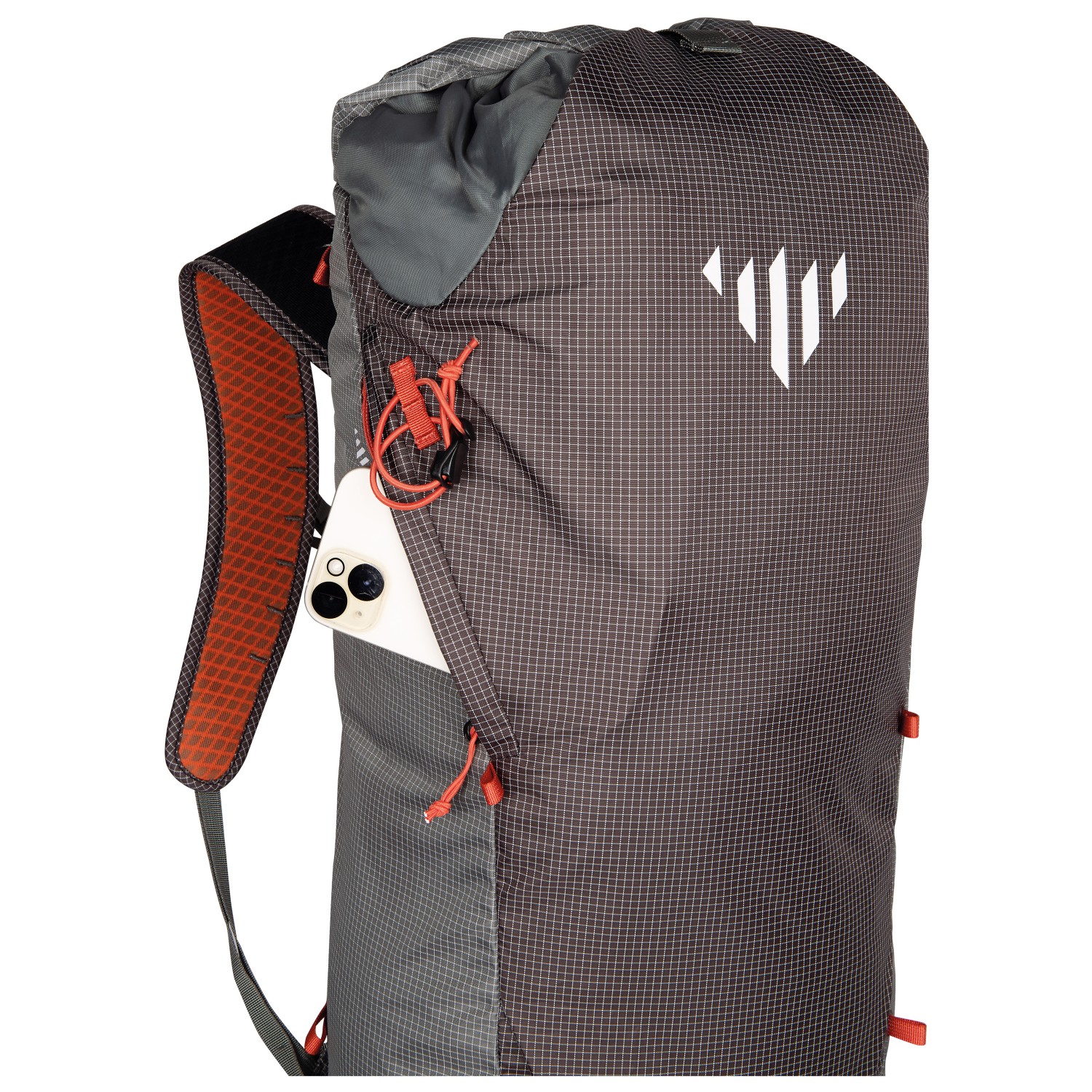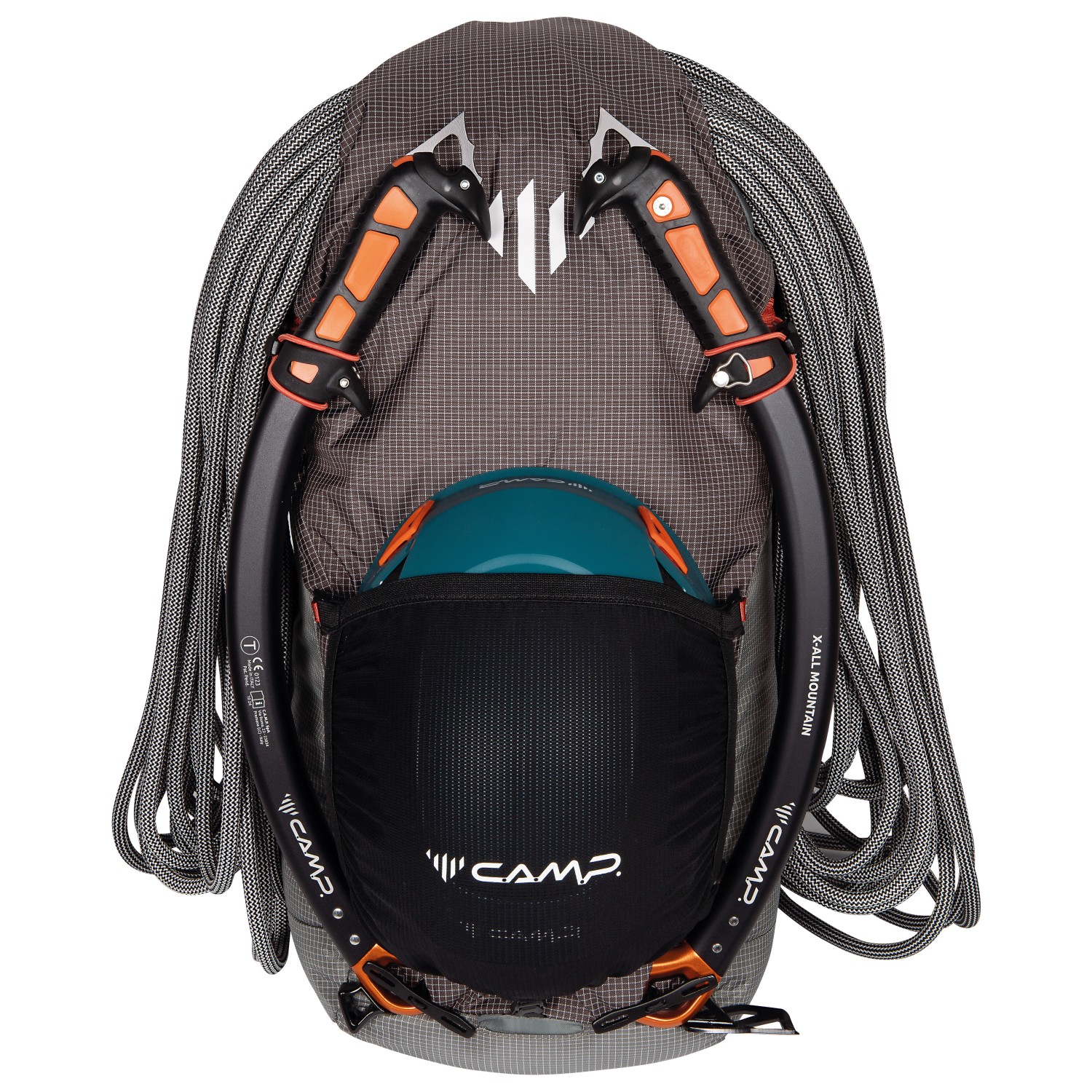 - soporte para piolets/bastones, soporte para casco, lazos de material, bolsillo exterior con cremallera, porta cuerdas