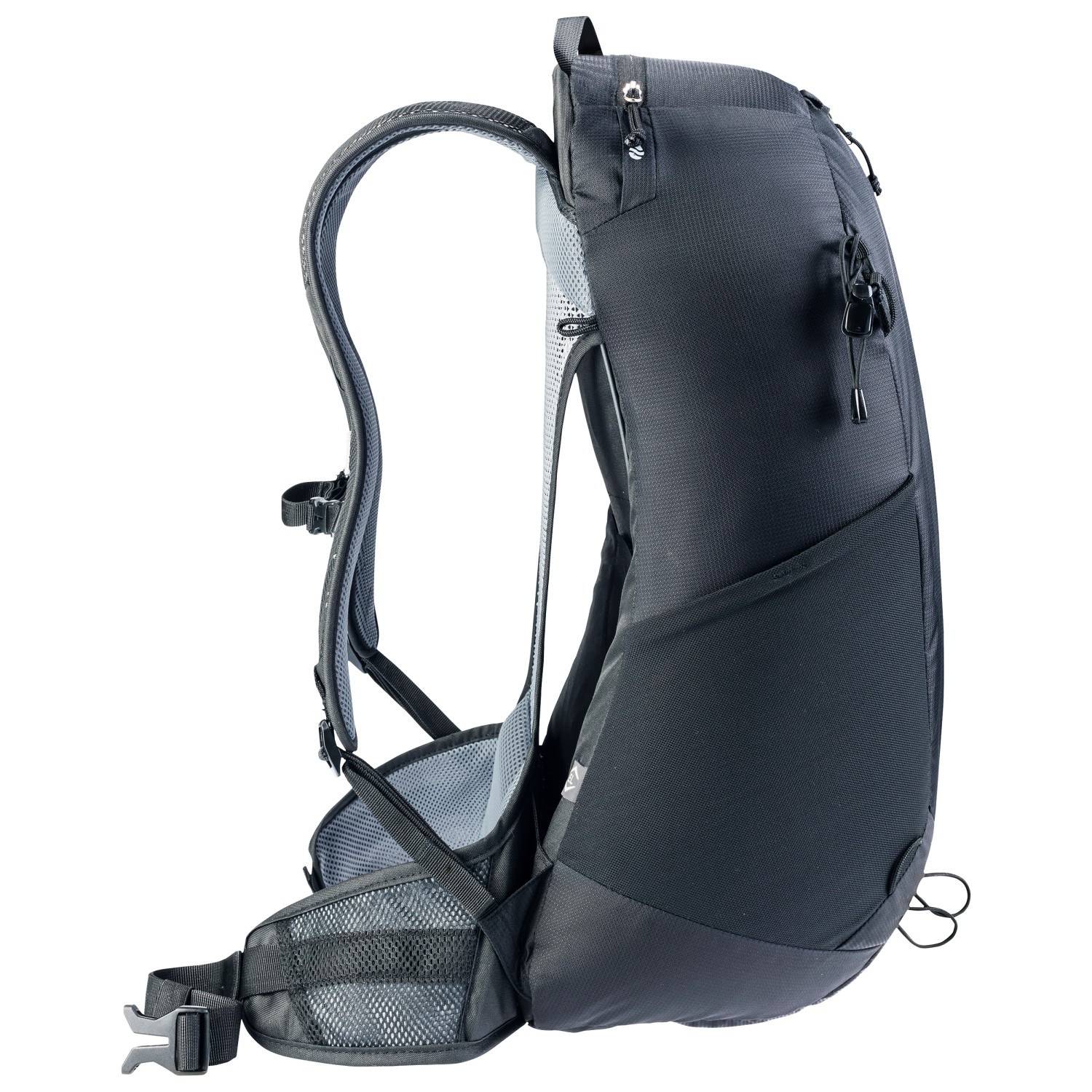 - fijación para bastones de trekking, correas de fijación en la parte delantera, soporte para gafas, clip para llaves, compartimento laterale de malla, 2 bolsillos exteriores con cremallera