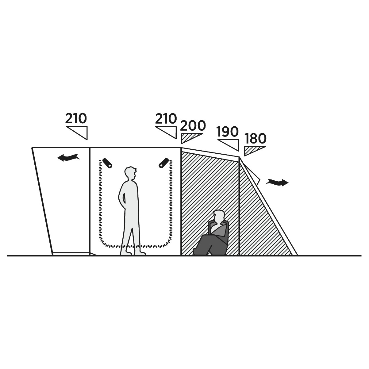 - zona de estar: 175 x 295 x 210 cm; dormitorio 3 personas: 210 x 165 x 200 cm; dormitorio 2 personas: 210 x 110 x 200 cm
