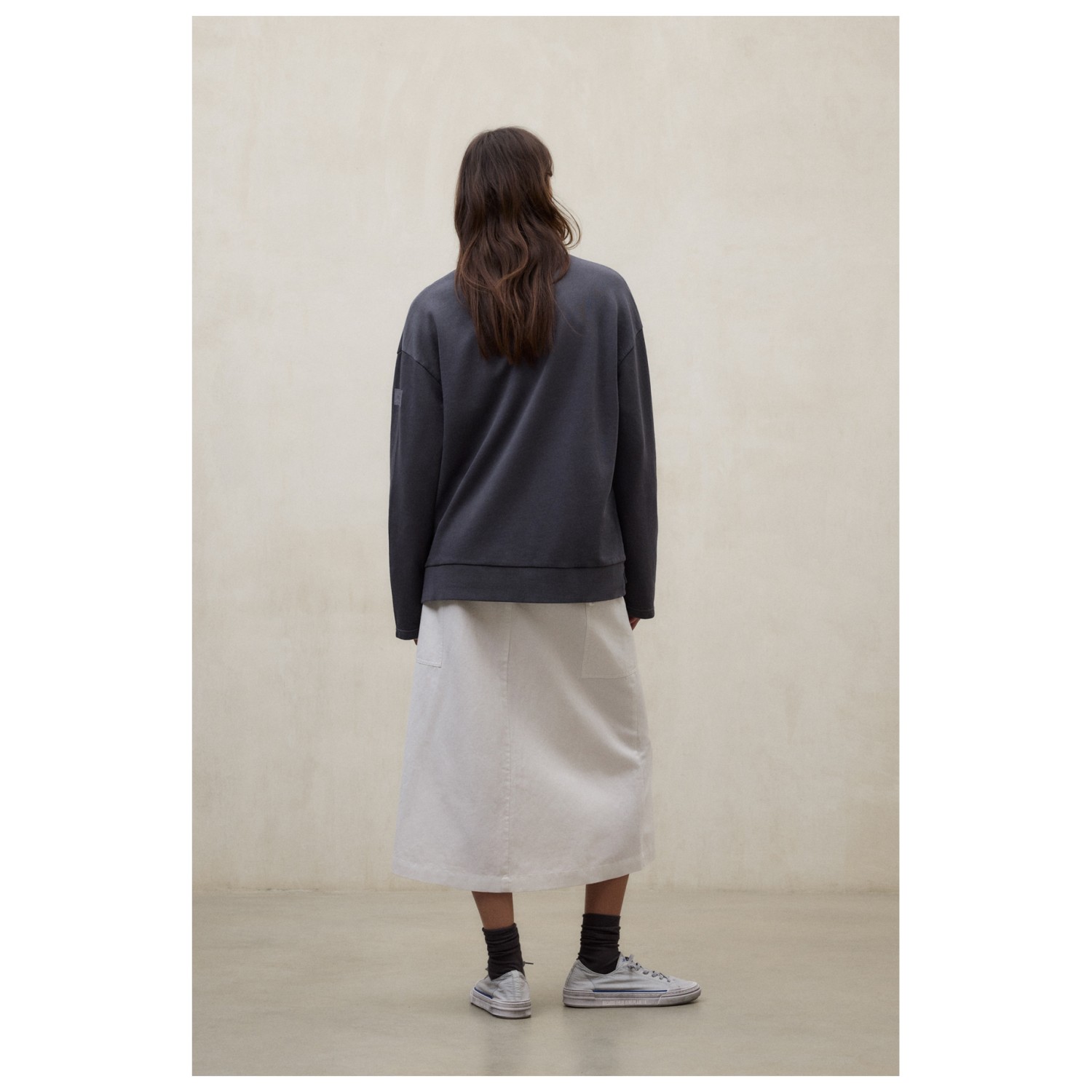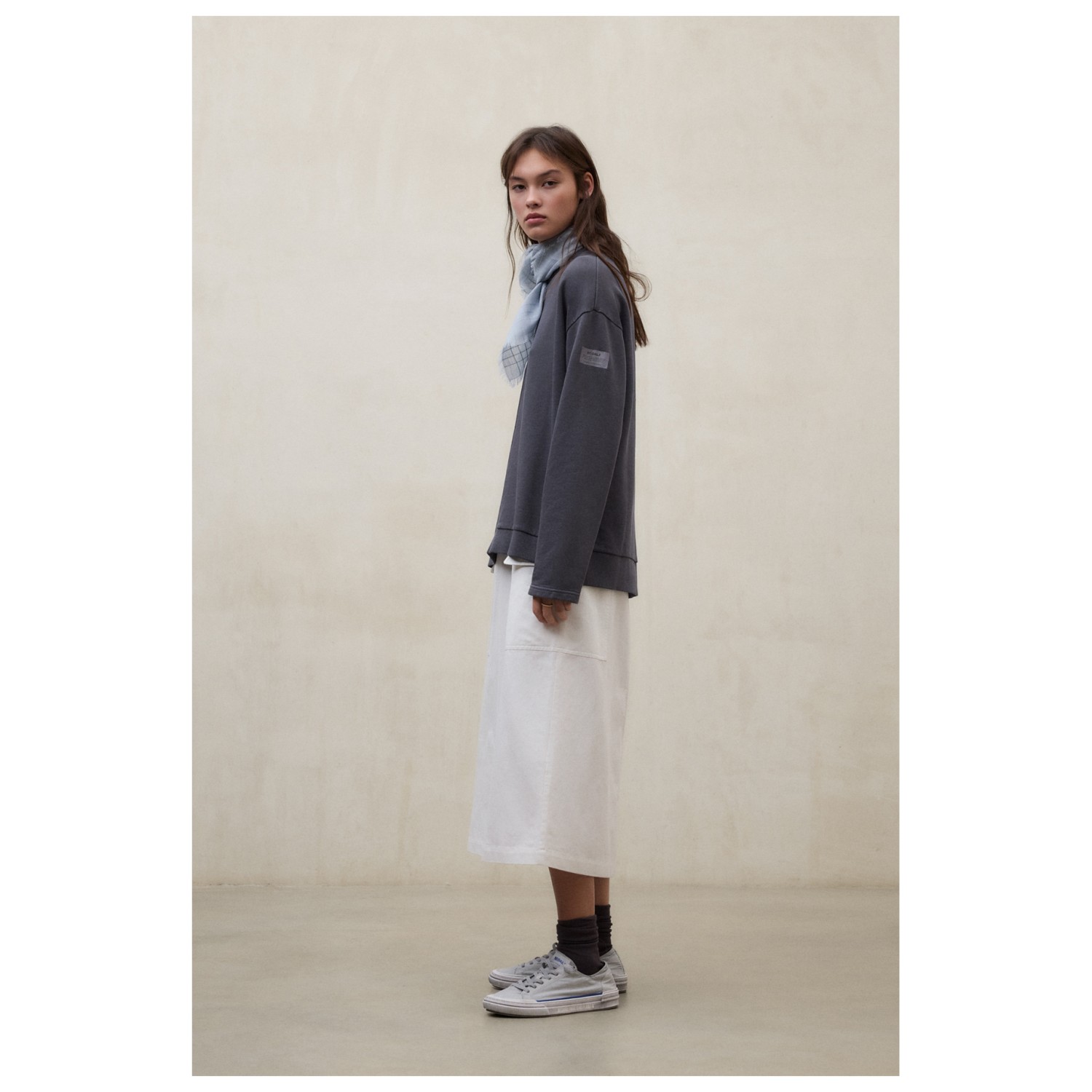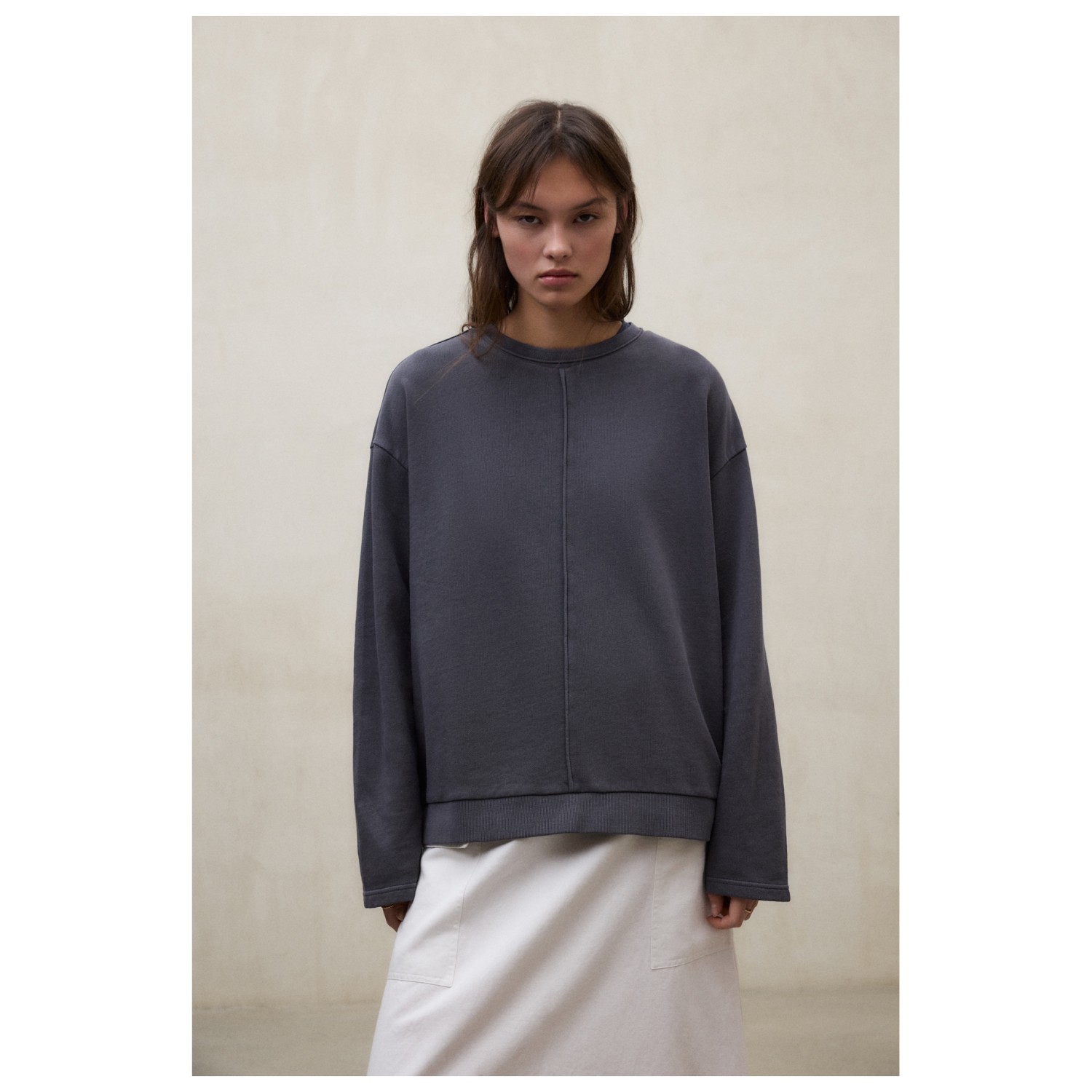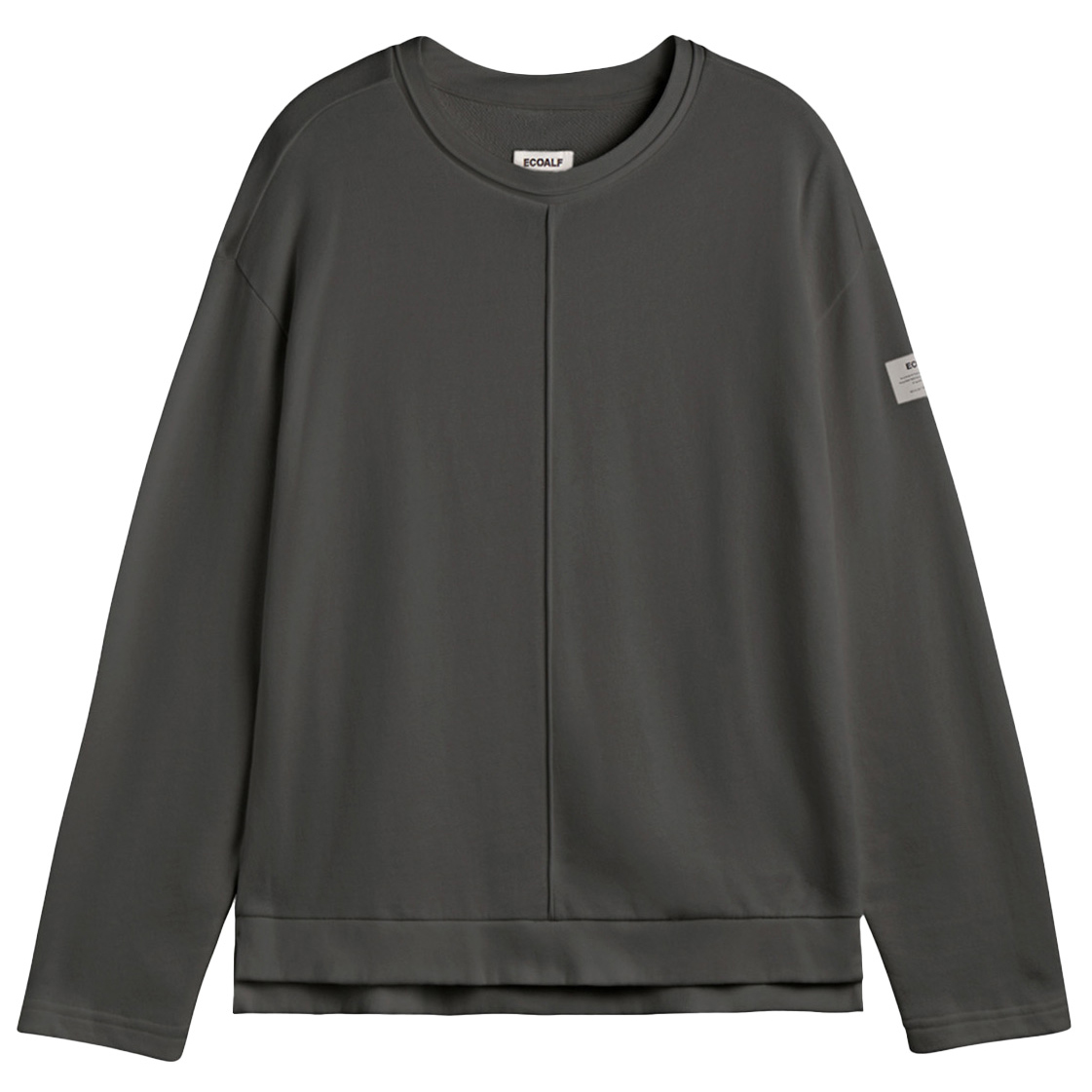 - Parche del logotipo, puños de canalé, cuello redondo, costuras de los hombros desplazadas