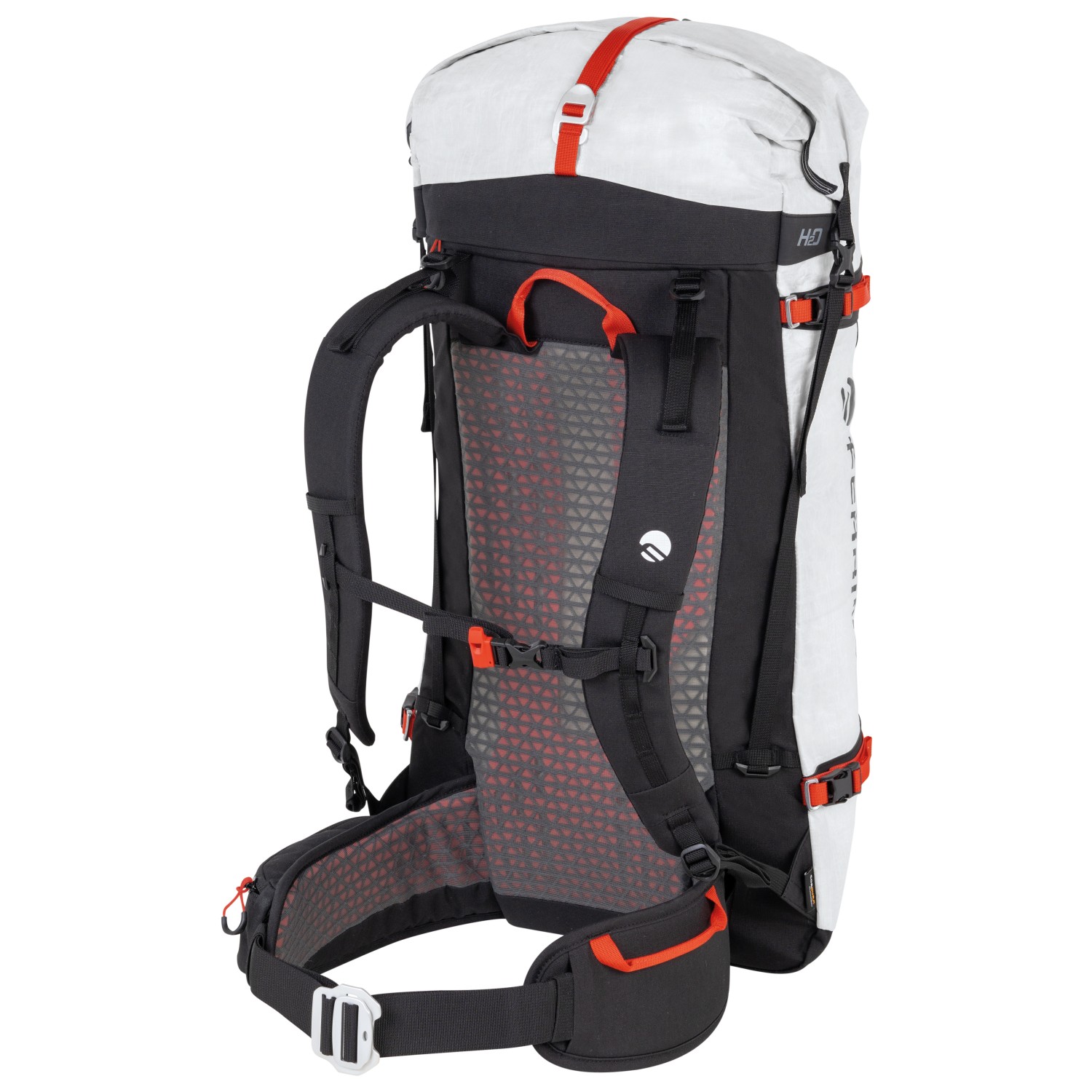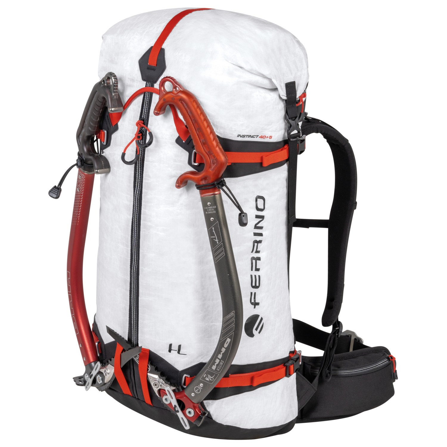 - 2 bolsillos en el cinturón lumbar, correas de fijación en la parte delantera, soporte para piolets/bastones, soporte para casco, porta cuerdas