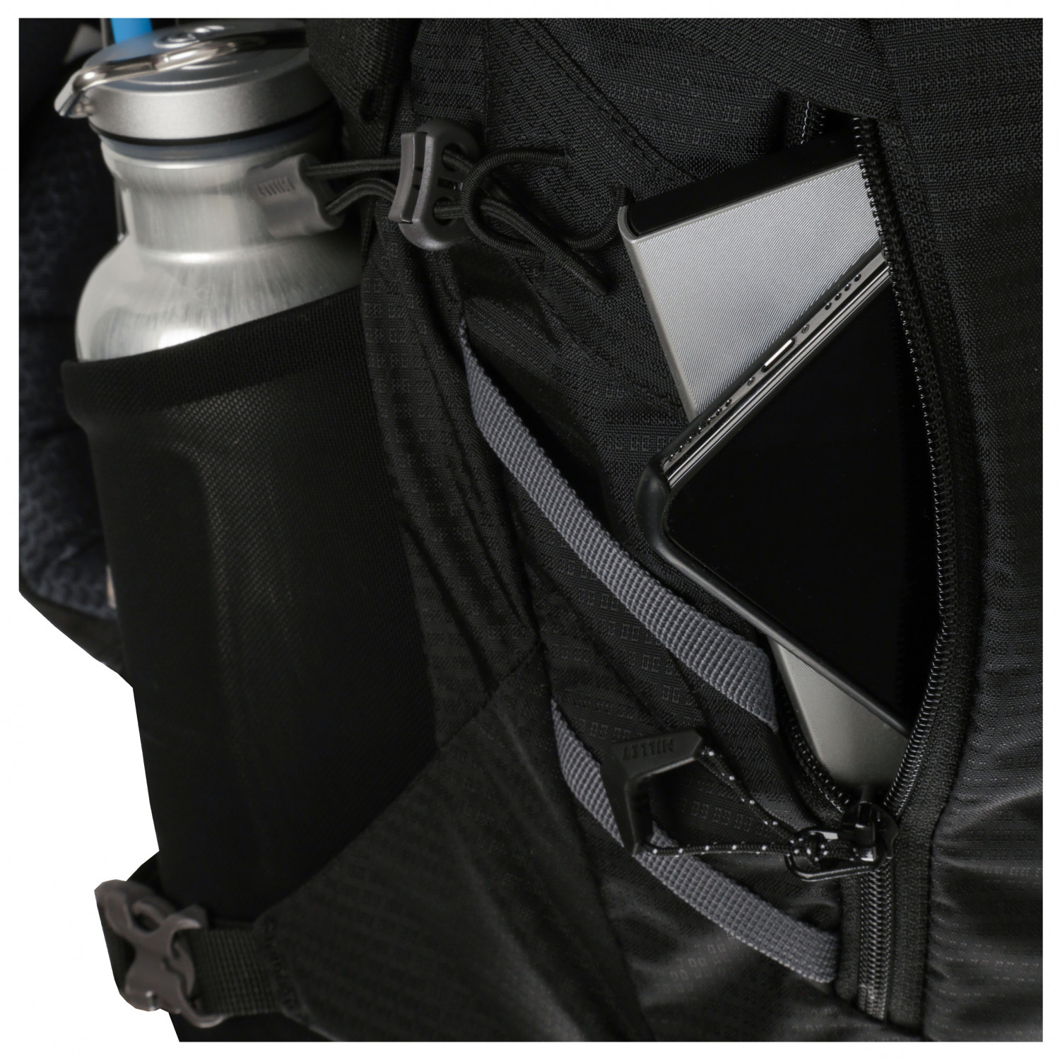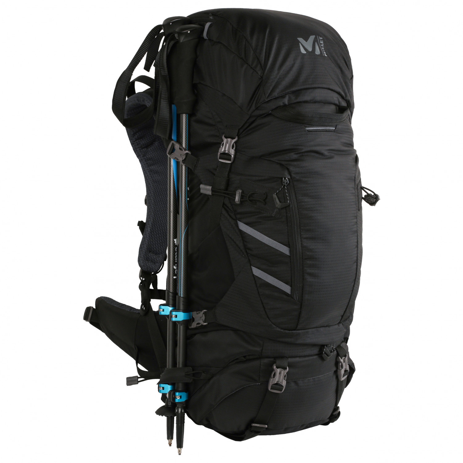 - 2 bolsillos en el cinturón lumbar, 2 bolsillos con cremallera, correas de fijación en la parte delantera, soporte para piolets/bastones, compartimento delantero, clip para llaves, compartimento elástico
