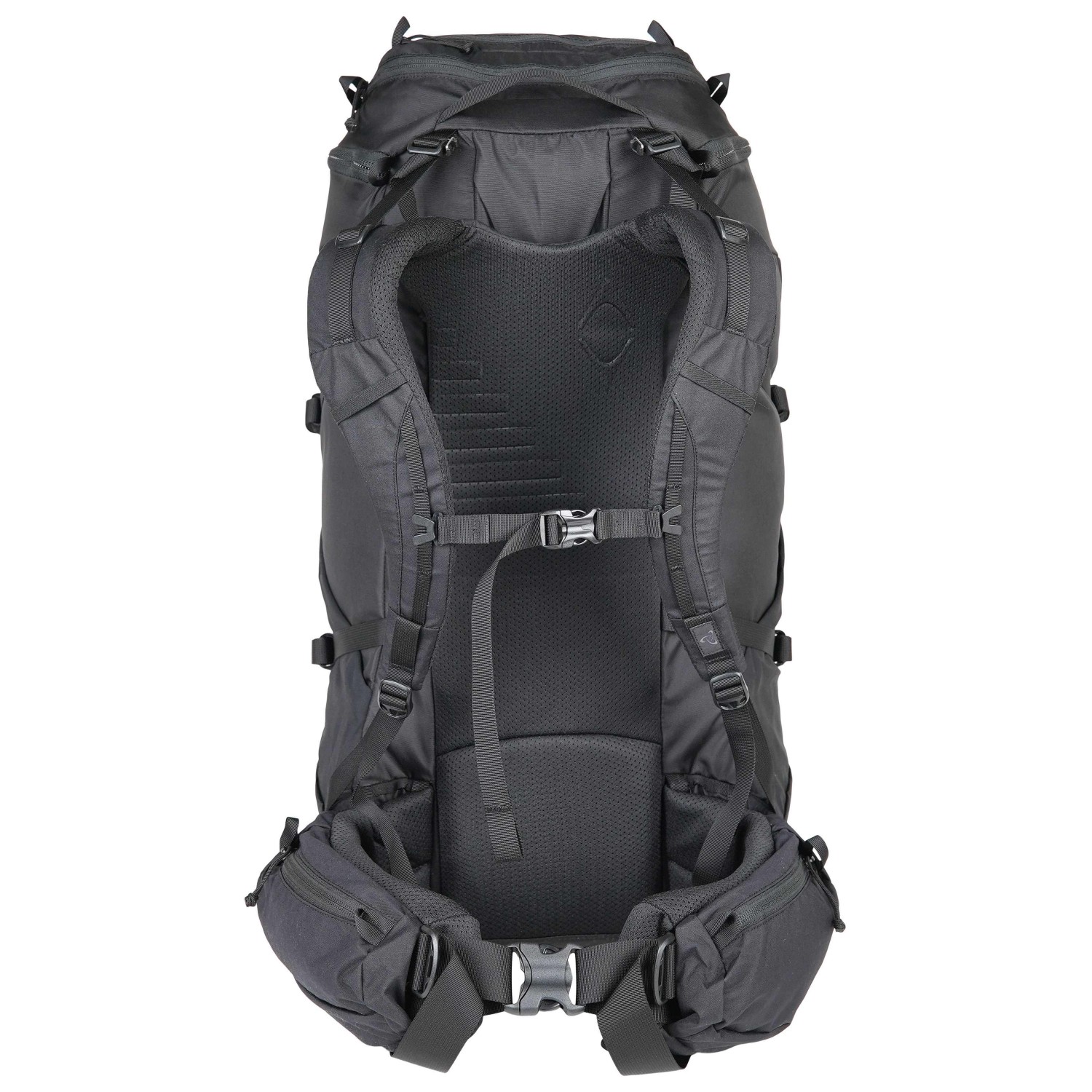 - 2 compartimentos delanteros, 2 bolsillos en el cinturón lumbar, 2 compartimentos laterales, sujeción con goma elástica, compartimento para saco de dormir
