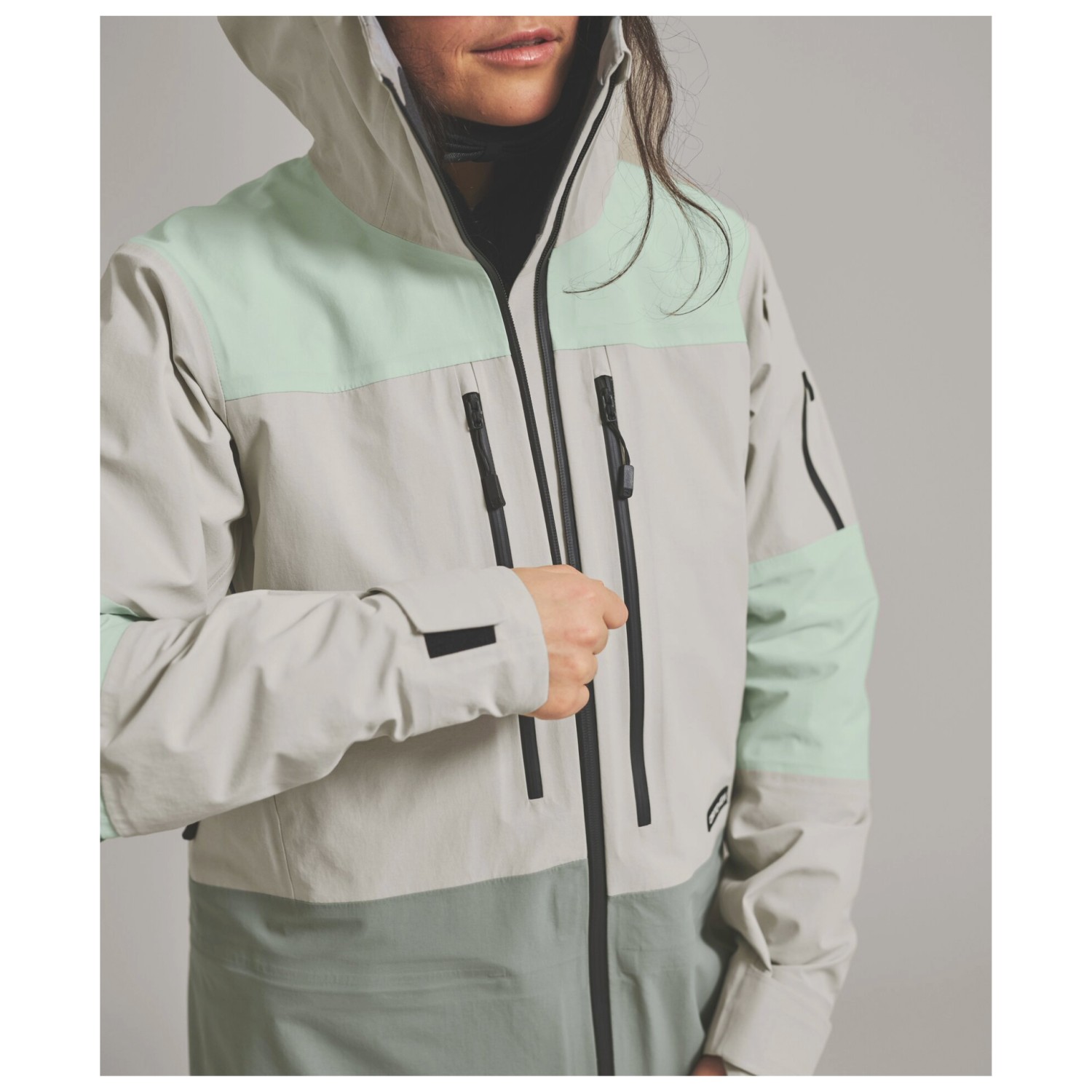 - Faldón para nieve desmontable, Cierres de gancho y bucle en las mangas, Cordón de ajuste en el dobladillo