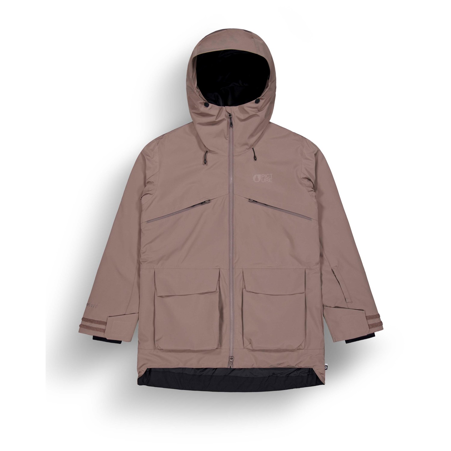 - puños interiores elásticos, Cierres de gancho y bucle en las mangas, Cordón de ajuste en el dobladillo, Faldón para nieve