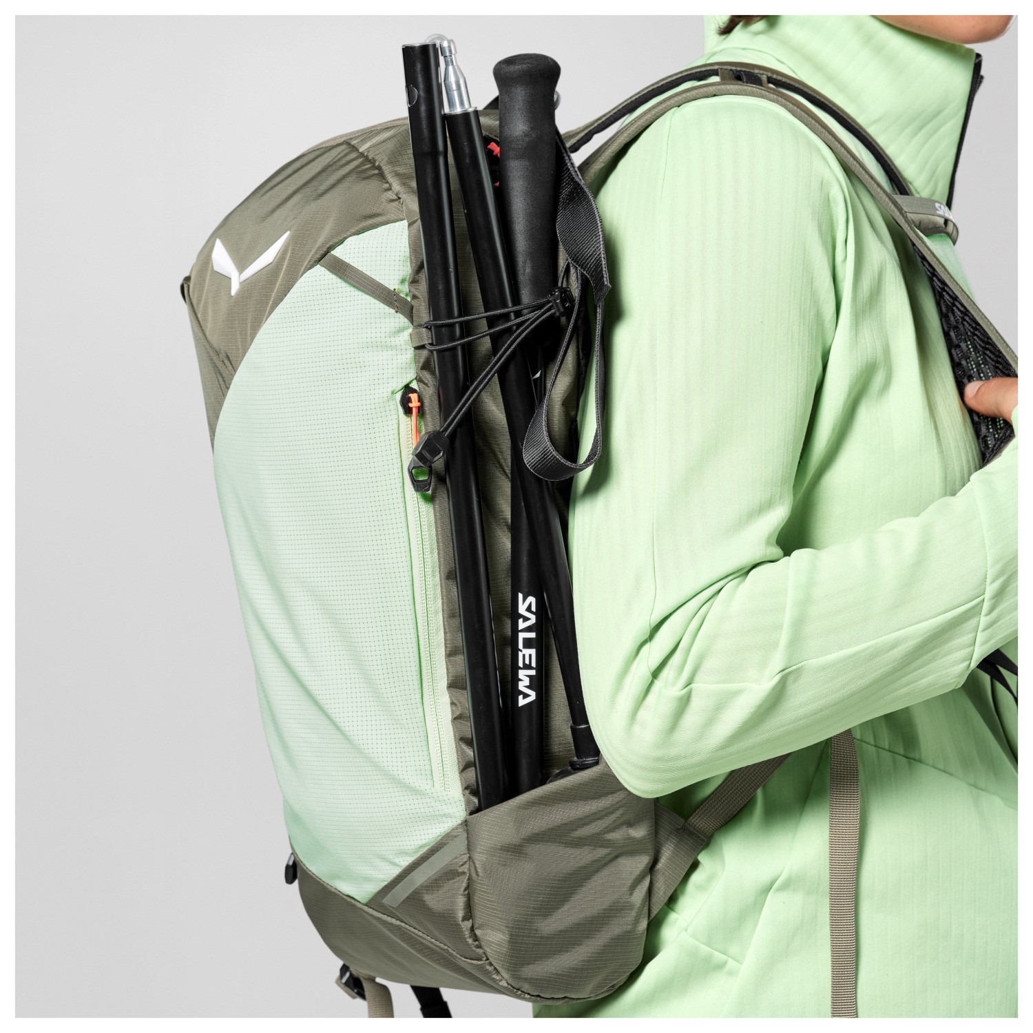 - soporte para piolets/bastones, portabidones, compartimento delantero, compartimento interior, clip para llaves, bolsillo en el tirante, compartimento para objetos de valor