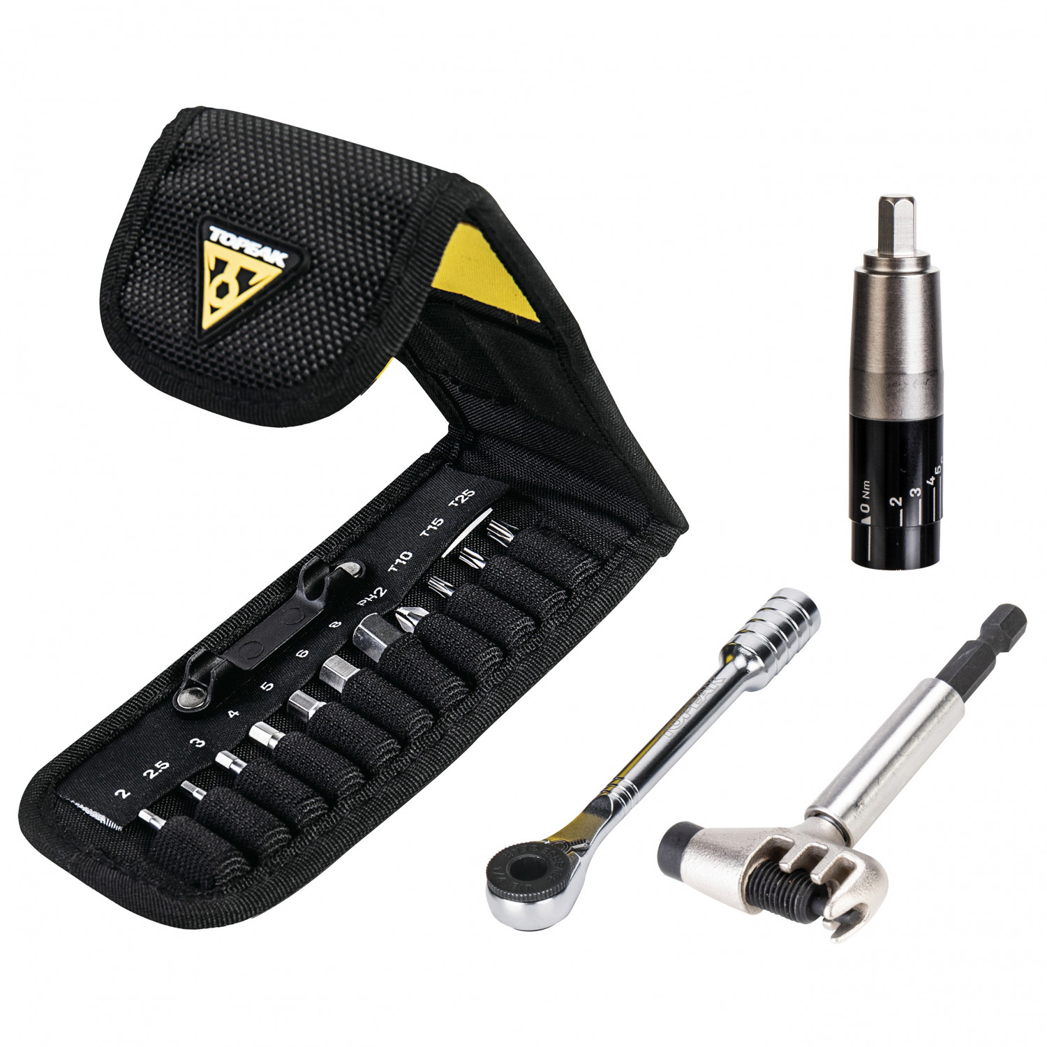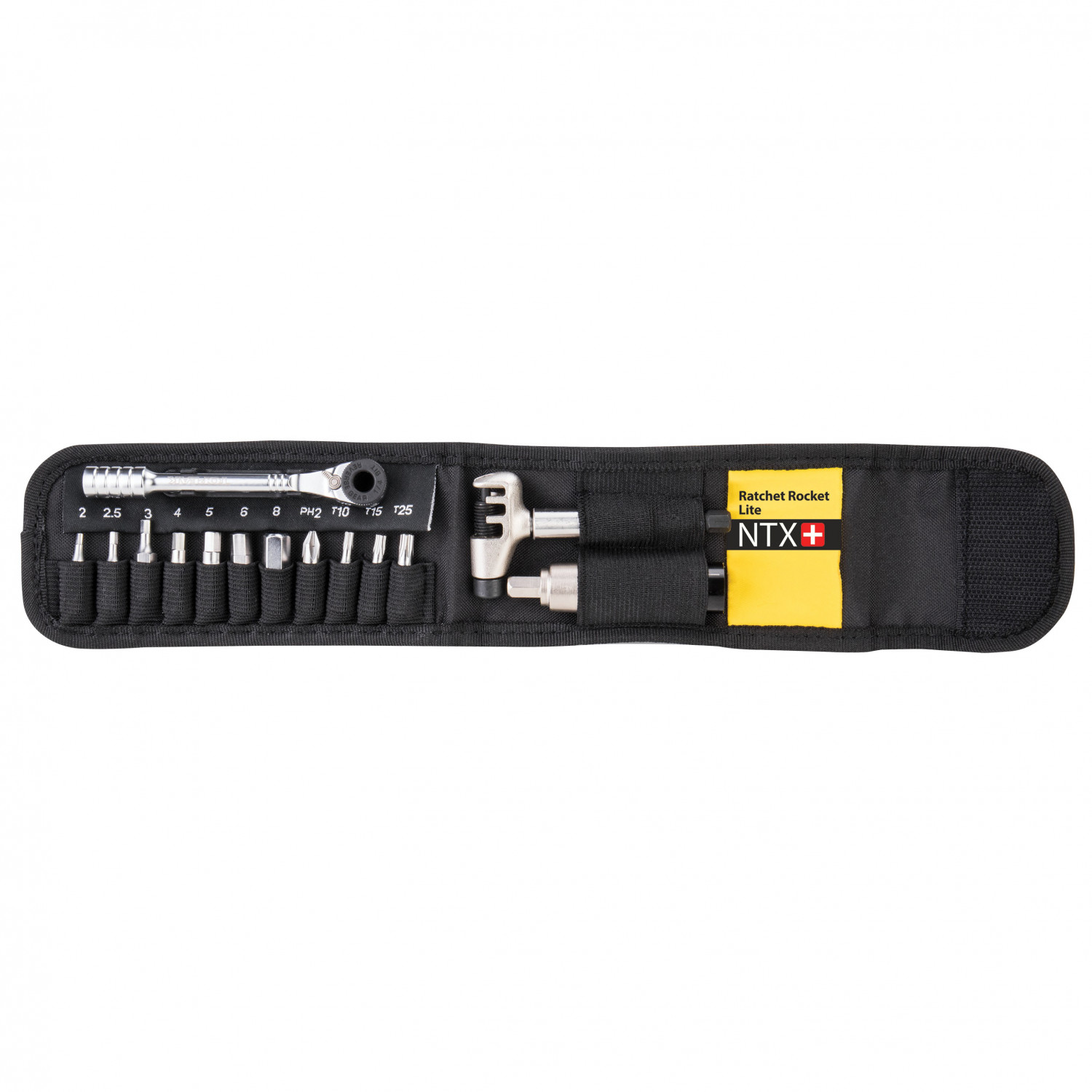 - carraca; tronchacadenas; extensión para punta; suplemento dinamométrico; 2 palancas de desmontaje para neumáticos; hexágono interior 2/2,5/3/4/5/6/8 mm; T10/T15/T25 Torx; estrella #2; bolsa de transporte
