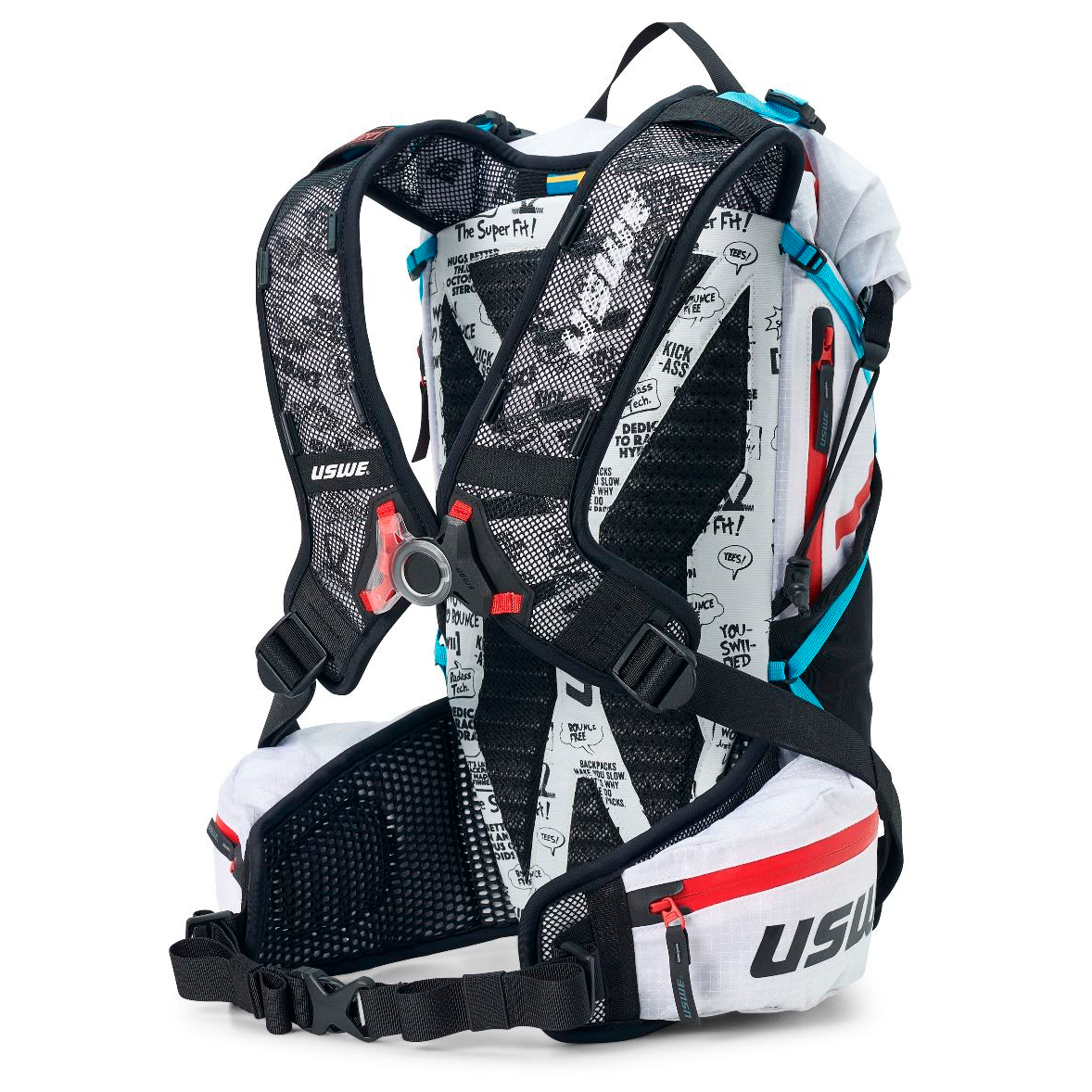 - 2 bolsillos en el cinturón lumbar, 2 bolsillos exteriores con cremallera, soporte para casco, soporte para luz trasera, bolsillo interior impermeable